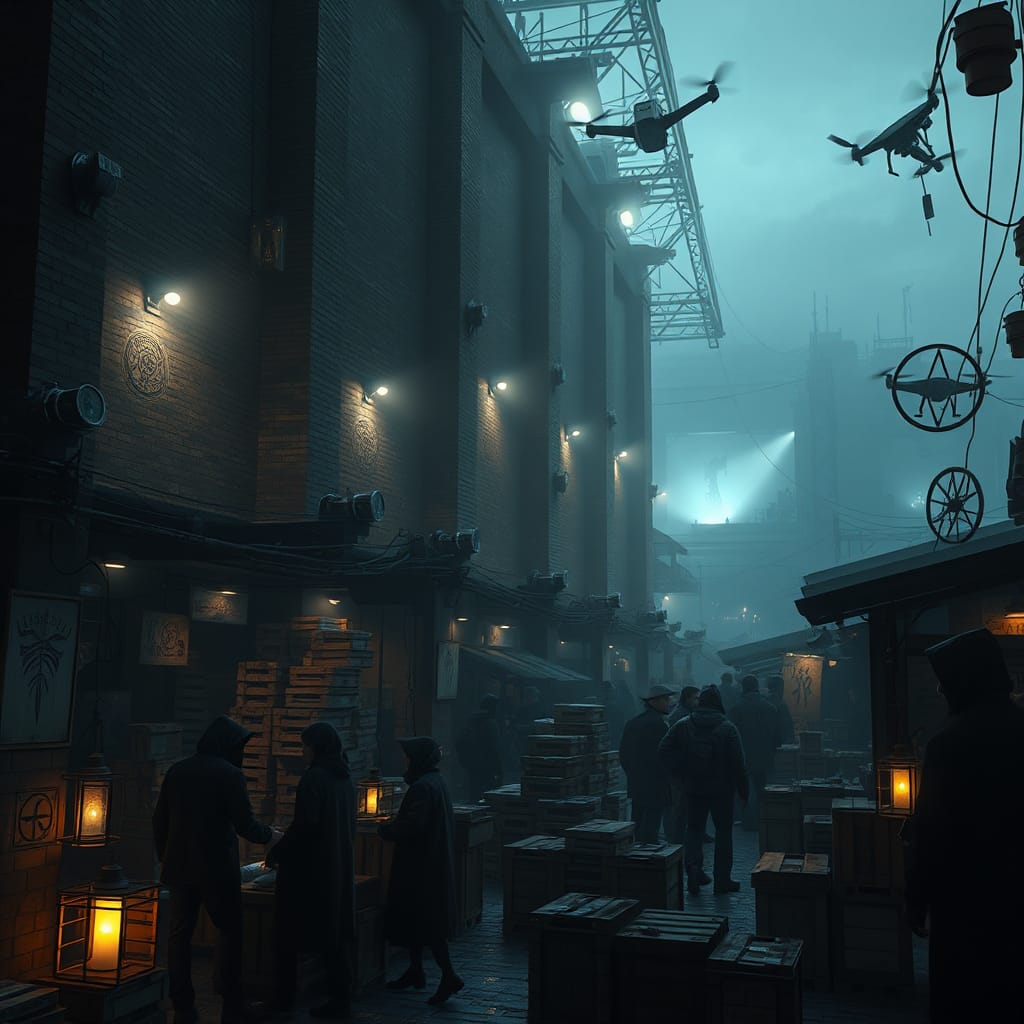 Der Fruchthof Hamburg - Zentrum des Verbotenen Inmitten der verfallenen Überreste von Hamburgs stolzem Handelsimperium liegt der Fruchthof - einst Umschlagplatz für exotische Früchte, heute ein düsteres Epizentrum für den Schattenhandel. Unter zerbrochenen Überwachungskameras und verwaschenen Grafitti verwandeln sich die verlassenen Hallen bei Nacht in ein labyrinthisches Geflecht aus zwielichtigen Geschäftspartnern und illegalen Waren. Wo einst prall gefüllte Obstkisten gestapelt waren, wechseln nun Drogen, Waffen und verbotene Artefakte in einem undurchsichtigen Schwarzmarkt den Besitzer. Die Atmosphäre ist schwer von kaltem Nebel, schummrigen Neonlichtern und dem stetigen Summen der Überwachungsdrohnen, die über den Hallen schweben. Für jene, die ins Dunkel der Schatten eintauchen, verspricht der Fruchthof eine Vielzahl an Möglichkeiten - lukrative Geschäfte und den Zugang zu seltenen Waren, jedoch stets im Spannungsfeld zwischen lohnendem Risiko und tödlicher Gefahr.