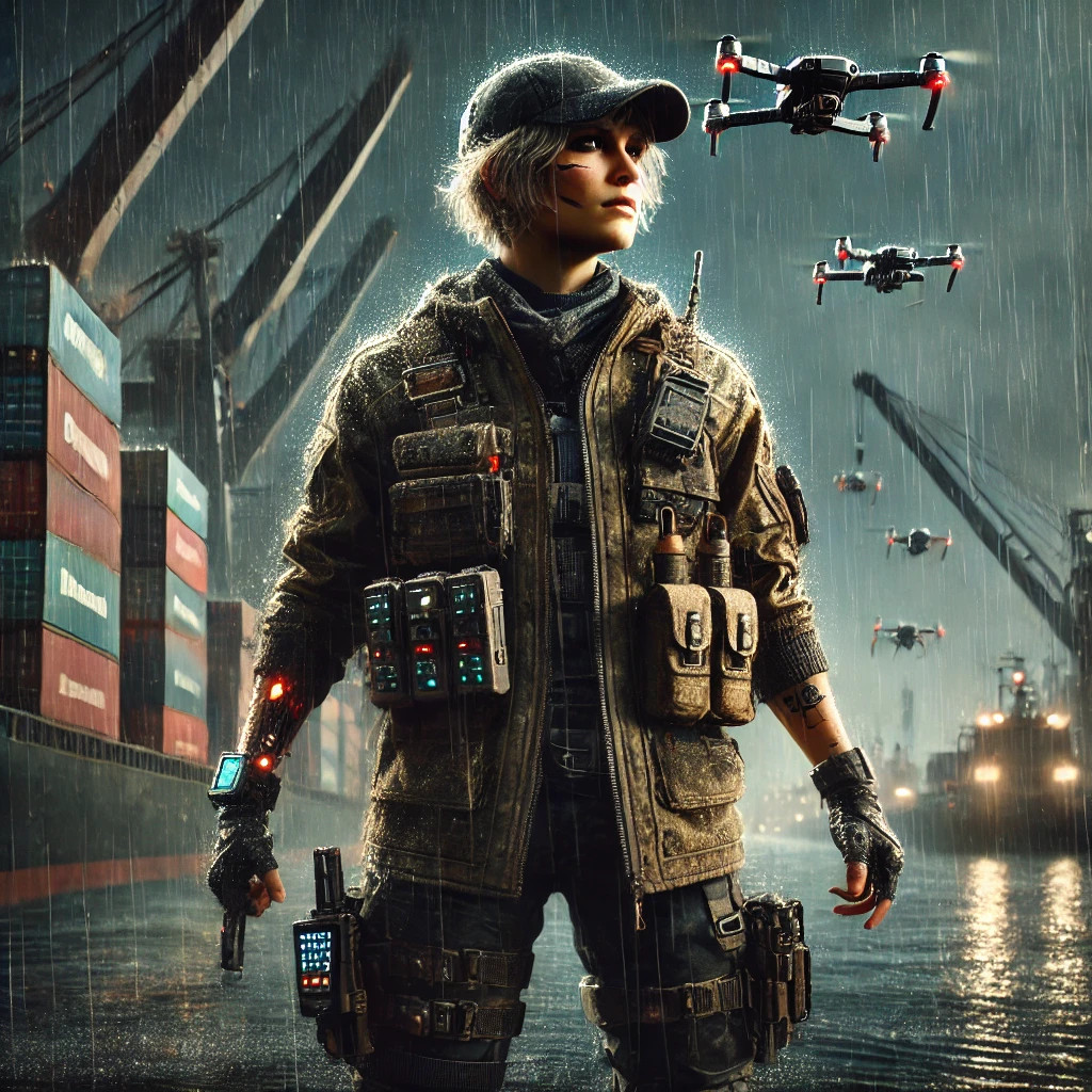 Helga „Kraken“ Schneider – Riggerin und Königin der Wasserwege Eine der berüchtigtsten Schmugglerinnen Hamburgs, bekannt für ihre tödliche Effizienz und ihre unfehlbare Kontrolle über ganze Schwärme von Drohnen. Sie bewegt sich zwischen den Schatten der Hafenstadt, wo die Container wie Zähne aus rostigem Metall ragen, und hält die Schmuggelrouten wie die Tentakel eines Kraken fest in der Hand.