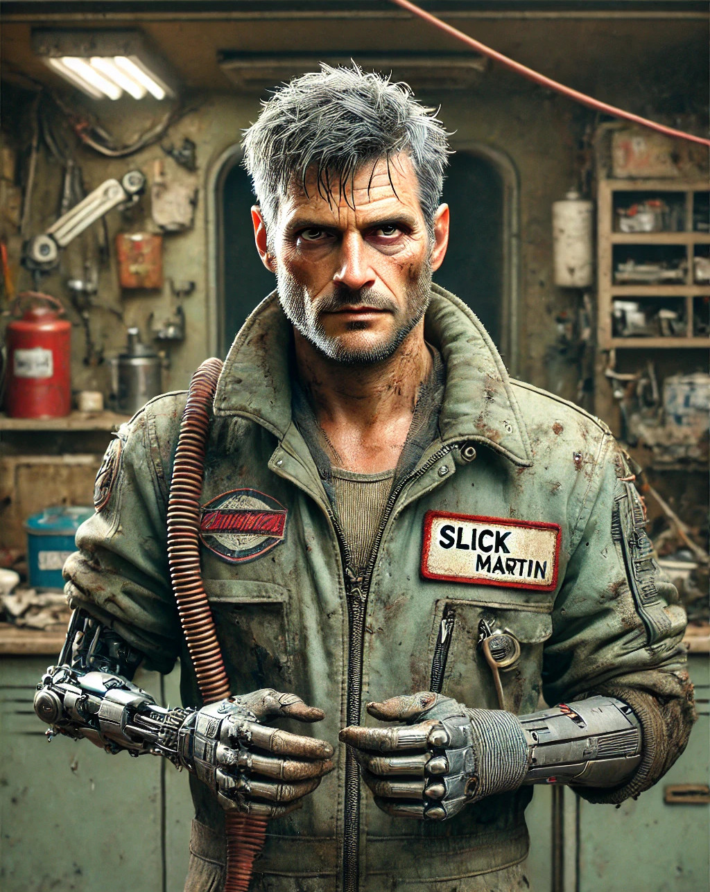 Slick Martin - Der Mechaniker, den du rufst, wenn alles auf dem Spiel steht. Wenn dein Fluchtfahrzeug mitten im Run zusammenbricht oder deine Drohne unter Beschuss den Geist aufgibt, brauchst du jemanden, der schneller repariert, als die Kugeln fliegen. Slick Martin ist der Mann für diesen Job. Mit seinem gepanzerten Werkstattwagen und einem Cyberarm voller High-Tech-Tools kommt er direkt zu dir - egal, wie gefährlich es wird. Aber Vorsicht: Slick hat ein gefährliches Laster - das Glücksspiel - und wenn du ihm hilfst, seine Schulden zu begleichen, könnte er dein Leben retten… oder dich noch tiefer in die Schatten ziehen.